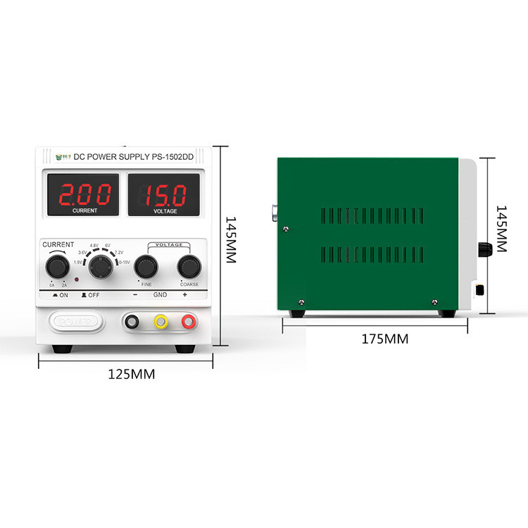 Alimentation électrique DC, modèle PS-1502DD, couramment utilisée pour la réparation d'appareils électroniques, notamment les téléphones portables et les ordinateurs portables.