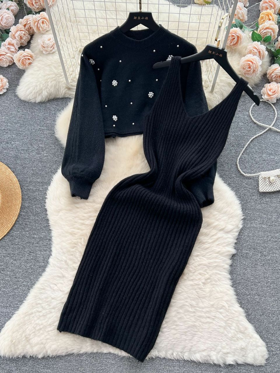 Ensemble de 2 pièces de robe Pull court à manches longues perlées à col rond, ensembles assortis , robe taille haute,