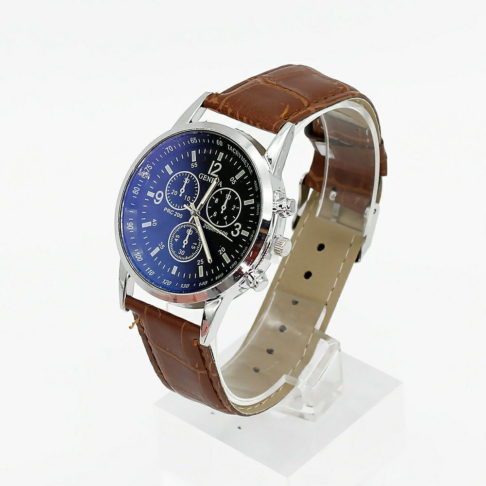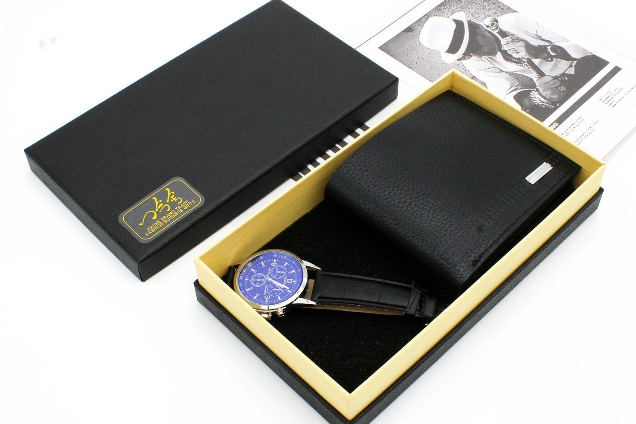 Ensemble cadeau comprenant une montre-bracelet et un portefeuille marron en cuir texturé, présentés dans un coffret noir.