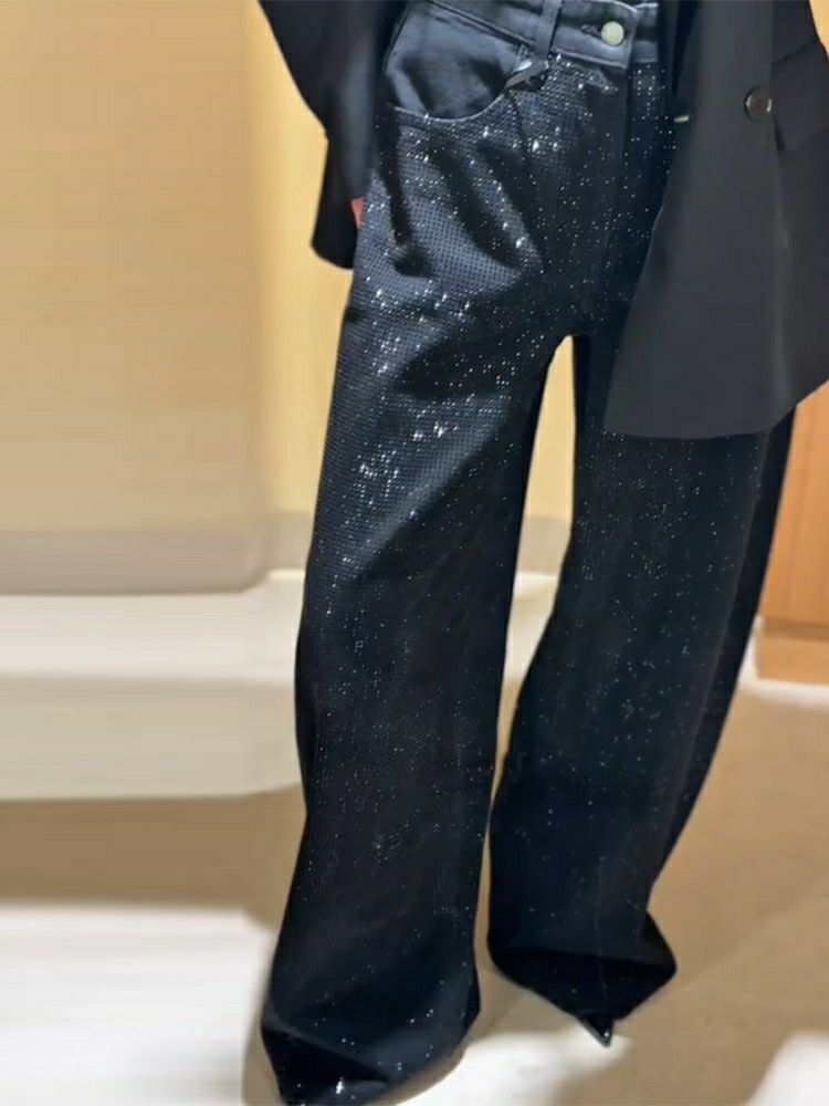 Nouveau pantalon jean ballon large noir scintillant avec des paillettes tendance de qualité porté souvent avec un blazer noir pour femmes, pour personnalité à la mode polyvalent