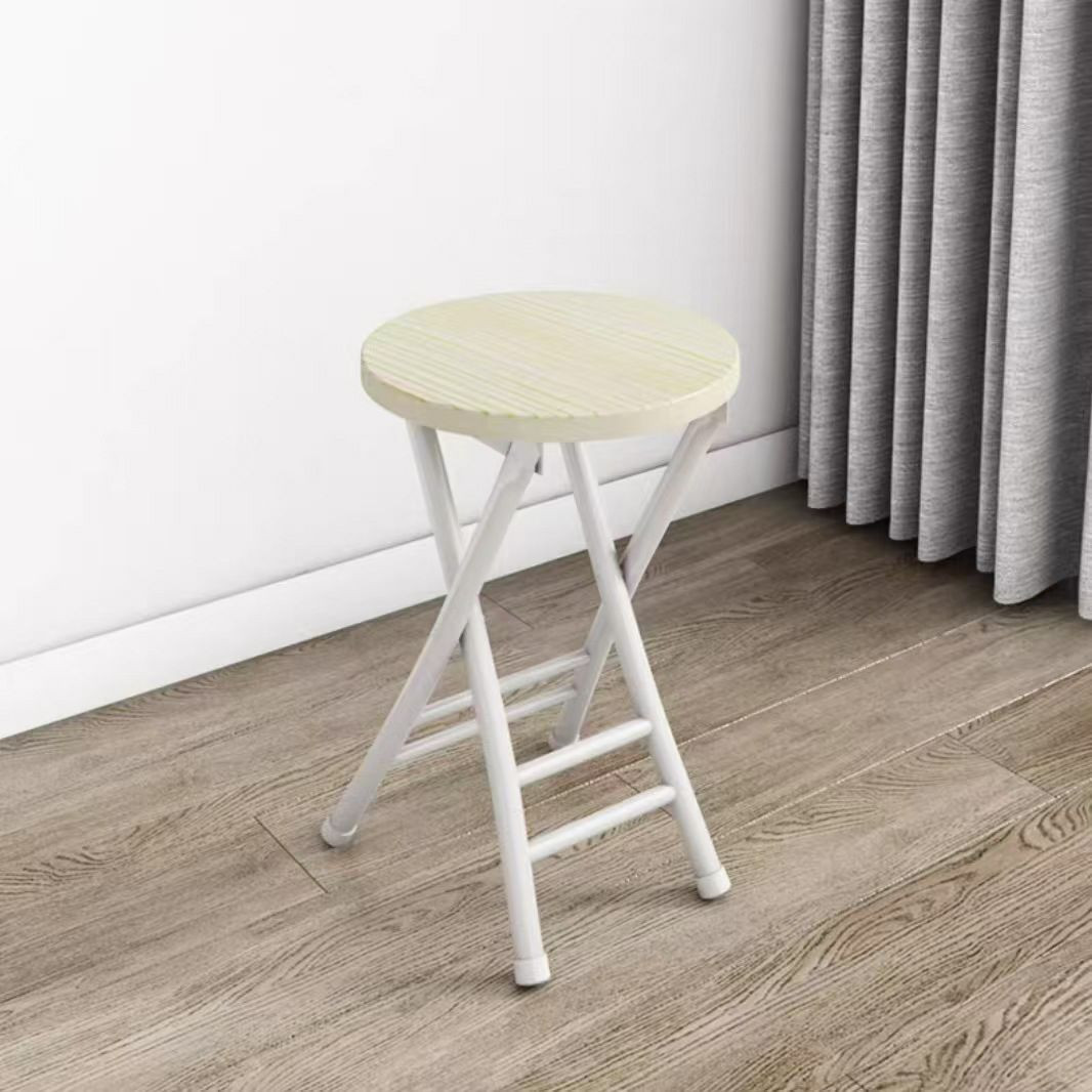 Tabouret pliant rond avec un plateau en bois et un cadre en métal portable de maison.