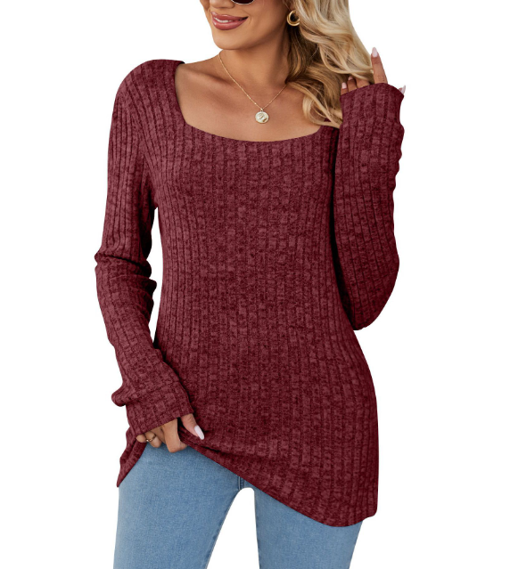 Hauts pour femmes automne et hiver nouveaux produits col carré bande de fosse brossé décontracté version longue T-shirt européen et américain femmes